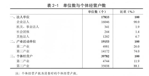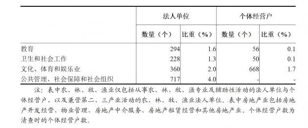 注:表中农、林、牧、渔业仅包括从事农、林、牧、渔专业及辅助性活动的法人单位与个体经营户,以及兼营第二、三产业活动的农、林、牧、渔业法人单位。表中房地产业包括房地产开发经营、物业管理、房地产中介服务、房地产租赁经营和其他房地产业。个体经营户数为清查时的个体经营户数。