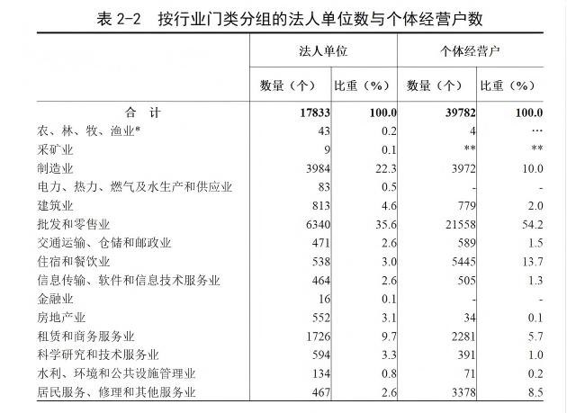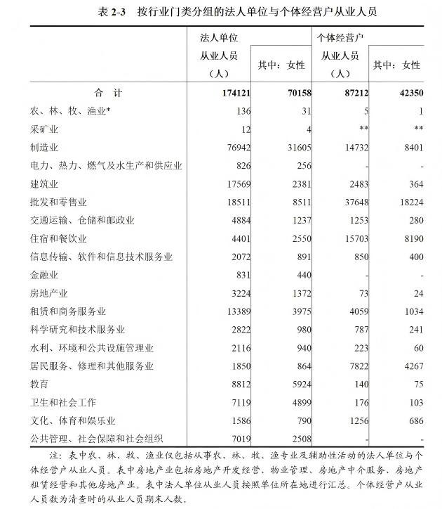注:表中农、林、牧、渔业仅包括从事农、林、牧、渔专业及辅助性活动的法人单位与个体经营户从业人员。表中房地产业包括房地产开发经营、物业管理、房地产中介服务、房地产租赁经营和其他房地产业。表中法人单位从业人员按照单位所在地进行汇总。个体经营户从业人员数为清查时的从业人员期末人数。