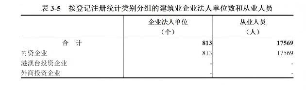 建筑业企业法人单位从业人员中,内资企业17569人,占100%;港澳台投资企业0人,占0%;外商投资企业0人,占0%(详见表3-5)。