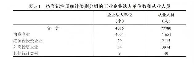 在工业企业法人单位从业人员中,内资企业71651人,占92.1%;港澳台投资企业2115人,占2.7%;外商投资企业3974人,占5.1%(详见表3-1)。
