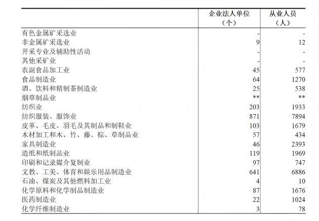 在工业企业法人单位中,采矿业9个,制造业3984个,电力、热力、燃气及水生产和供应业83个,分别占0.2%、97.7%和2%。在工业行业大类中,纺织服装、服饰业,文教、工美、体育和娱乐用品制造业,非金属矿物制品业企业法人单位数位居前三位,分别占21.4%、15.7%和7.8%。