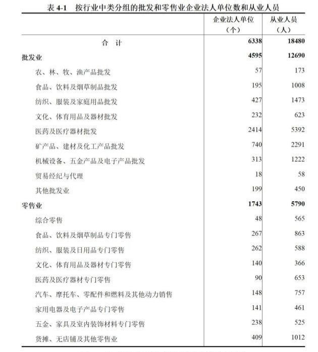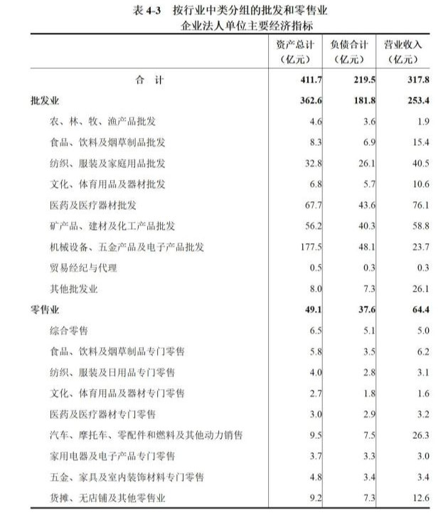 在批发和零售业企业法人单位中,批发业占72.5%,零售业占27.5%。在批发和零售业企业法人单位从业人员中,批发业占68.7%,零售业占31.3%(详见表4-1)。