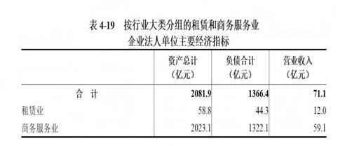 2023年末,租赁和商务服务业企业法人单位资产总计2081.9亿元,比2018年末增长165.1%。其中,租赁业企业法人单位资产总计58.8亿元,商务服务业企业法人单位资产总计2023.1亿元,分别比2018年末增长10倍和159.2%。租赁和商务服务业企业法人单位负债合计1366.4亿元,比2018年末增长146.4%。