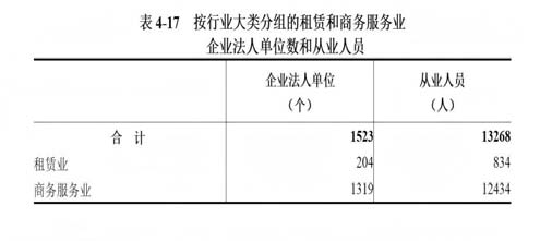 在租赁和商务服务业企业法人单位中,租赁业占13.4%,商务服务业占86.6%。在租赁和商务服务业企业法人单位从业人员中,租赁业占6.2%,商务服务业占93.8%(详见表4-17)。