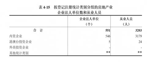 在房地产业企业法人单位从业人员中,内资企业占99.3%,港澳台投资企业占0.7%,外商投资企业占0.0%(详见表4-15)。