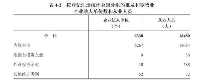 在批发和零售业企业法人单位从业人员中,内资企业占97.9%,港澳台投资企业占0.2%,外商投资企业占1.6%(详见表4-2)。