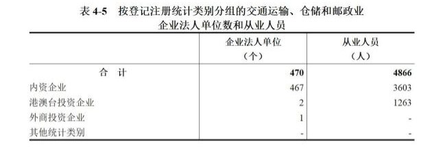 在交通运输、仓储和邮政业企业法人单位从业人员中,内资企业占74.0%,港澳台投资企业占26.0%,外商投资企业占0.0%(详见表4-5)。
