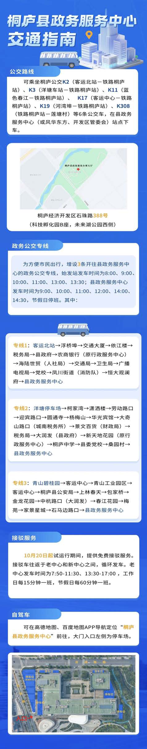 10月16日起,桐庐县政务服务办事大厅搬迁至桐庐经济开发区石珠路388号,10月20日起正式对外运行。许多市民朋友关心交通便利吗?哪几路公交可直达?自驾车停车位是否充裕?这份《桐庐县政务服务中心交通指南》请收好。
