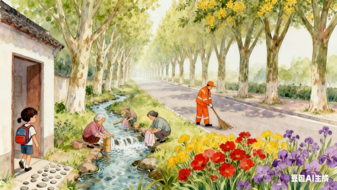 走出小区,我最先听到的就是附近小溪潺潺的流水声和奶奶们用棒槌敲衣服的“啪啪”声,它们混合在一起,好像一首古老的歌谣。紧接着,传来一阵“唰唰唰”的声音,那是环卫工人用扫帚在清扫街道呢。不一会儿,一阵音乐声传来,是洒水车唱着歌来了。它“嗞——”地喷水,为清晨的交响乐增添了一种新的音调。