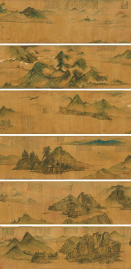在画卷中后半部分,江景规模缩小,两江交汇处开始出现一座江洲之上的近山,构成了一个颇为复杂的空间,侧身山体、入江交汇口、江中洲渚,小山以及远山,显现出了吴越山水标志形象。再往后复趋于平静,观者似临江而立,对望江山,平远的视象,却有“左中右三山”并“近中远三层”,以南望北,远处舟楫林立,城郭俨然,这是严州城(梅城)和“双塔凌云”的景致。最后一段突现如屏障般直立起来的陡峭山崖,山体形象变得复杂起来了,画面止于此,似乎也标志着北方中国(山水)的开始展现。他此行虽频遭险境但最终抵达了道教圣山白岳齐云山。