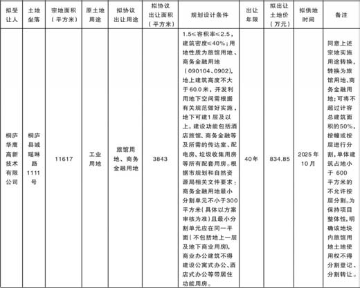 根据国土资源部《协议出让国有土地使用权规范》、《杭州市人民政府办公厅关于印发杭州市推进低效用地再开发试点工作实施方案的通知》(杭政办函〔2024〕2号)及《桐庐县人民政府办公室关于印发<桐庐县推进低效用地再开发试点工作实施细则>的通知》(桐政办函〔2024〕1号)、《桐庐县低效用地再开发试点工作实施细则补充规定》(桐政办函〔2025〕4号)的规定,现将我县低效再开发拟协议出让国有建设用地权宗地情况公示如下: