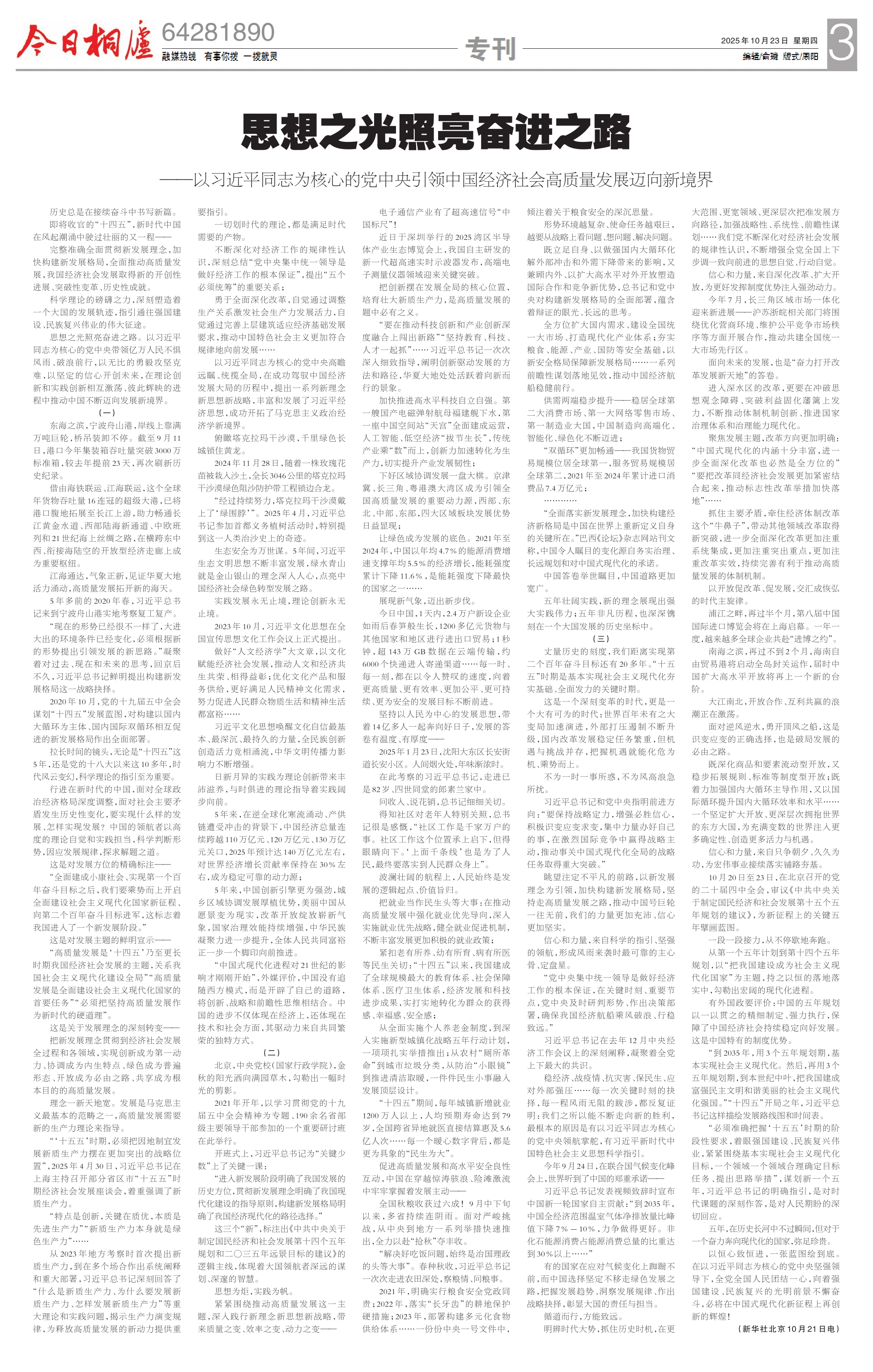 思想之光照亮奋进之路。以习近平同志为核心的党中央带领亿万人民不惧风雨、破浪前行,以无比的勇毅攻坚克难,以坚定的信心开创未来,在理论创新和实践创新相互激荡、彼此辉映的进程中推动中国不断迈向发展新境界。