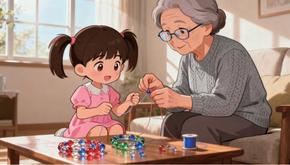 初学串珠时,眼睛瞪得像“斗鸡眼”,珠子却总不听话地滚得满地都是。我趴在地上一颗颗捡拾,外婆见状便搬来椅子坐在身旁,手把手教我穿线、对孔。渐渐熟练后,各色珠子在绳上排起长队,红的像盛夏樱桃,绿的似初春嫩叶,白的如冬日落雪,恰似把一年四季都串进了手链里。