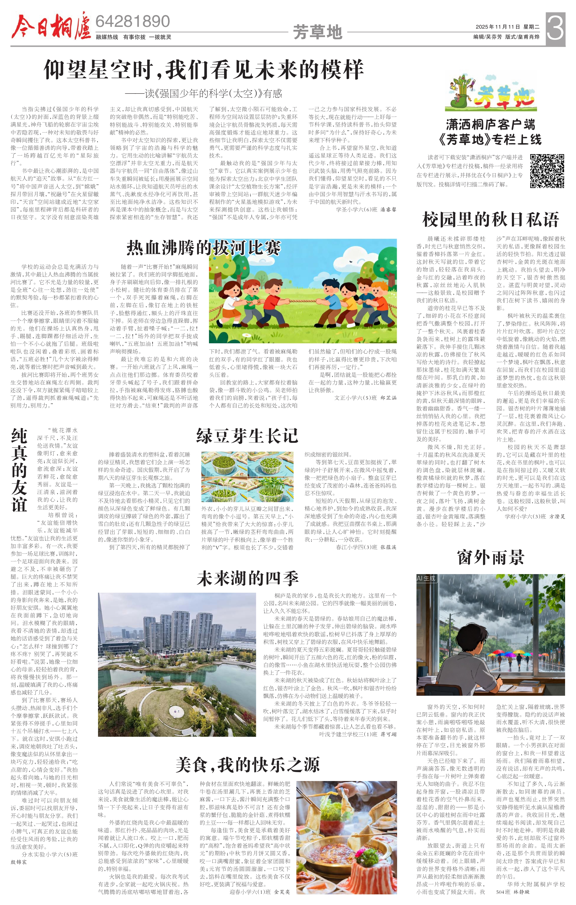 道旁的桂花早已等不及了,细碎的小花在不经意间把香气撒满整个校园,打开了一整个秋天。风裹着桂香袅袅而来,桂树上的露珠簌簌落下。我伸手接住几颗冰凉的秋露,仿佛接住了秋风写给大地的诗行。我轻撩起那抹墨绿,桂花如满天繁星缀在叶间。那乳白的黄,如清新淡雅的少女,在绿叶的掩护下沐浴秋风;而那橙红的黄,似秋天最深情的眼眸,散着幽幽甜香。香气一缕一丝悄悄钻入我的心里。我把掉落的桂花夹进笔记本,想留住这属于校园的、触手可及的美好。