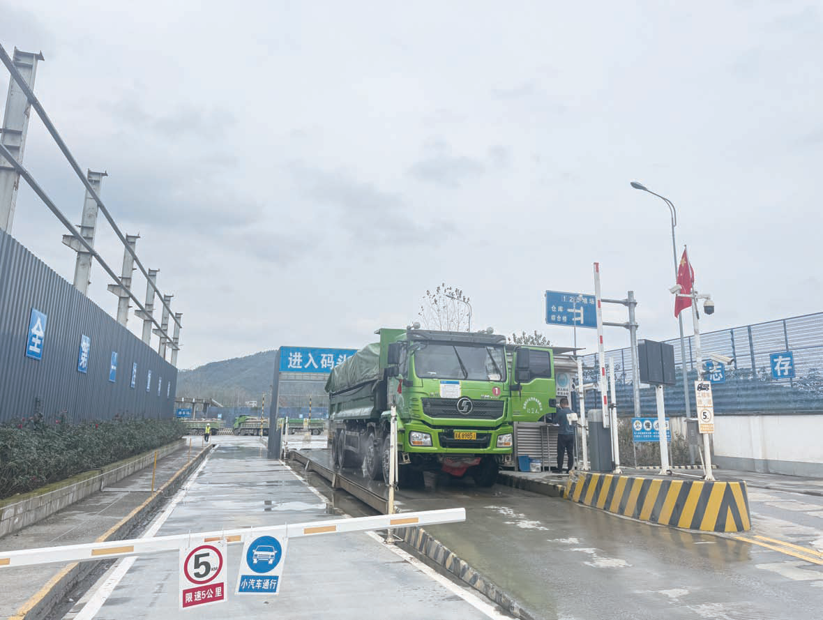 走进祥和码头内部,各车辆出场前都需经过冲洗车道。“我们专门设置了两道冲水装置,第一道是水槽,车辆通过时来回碾压,能让轮胎上黏附的大块泥块脱落;随后车辆驶入冲洗区域,对车厢、轮胎上残留的黄粘土进行二次冲洗,确保车辆干干净净出场,之后再进行称重放行。”祥和码头总经理马千里表示,码头已安排专人负责监督冲洗工作,实行24小时两班制倒班,全程把控每一辆出场车辆的清洁,杜绝带泥上路情况。