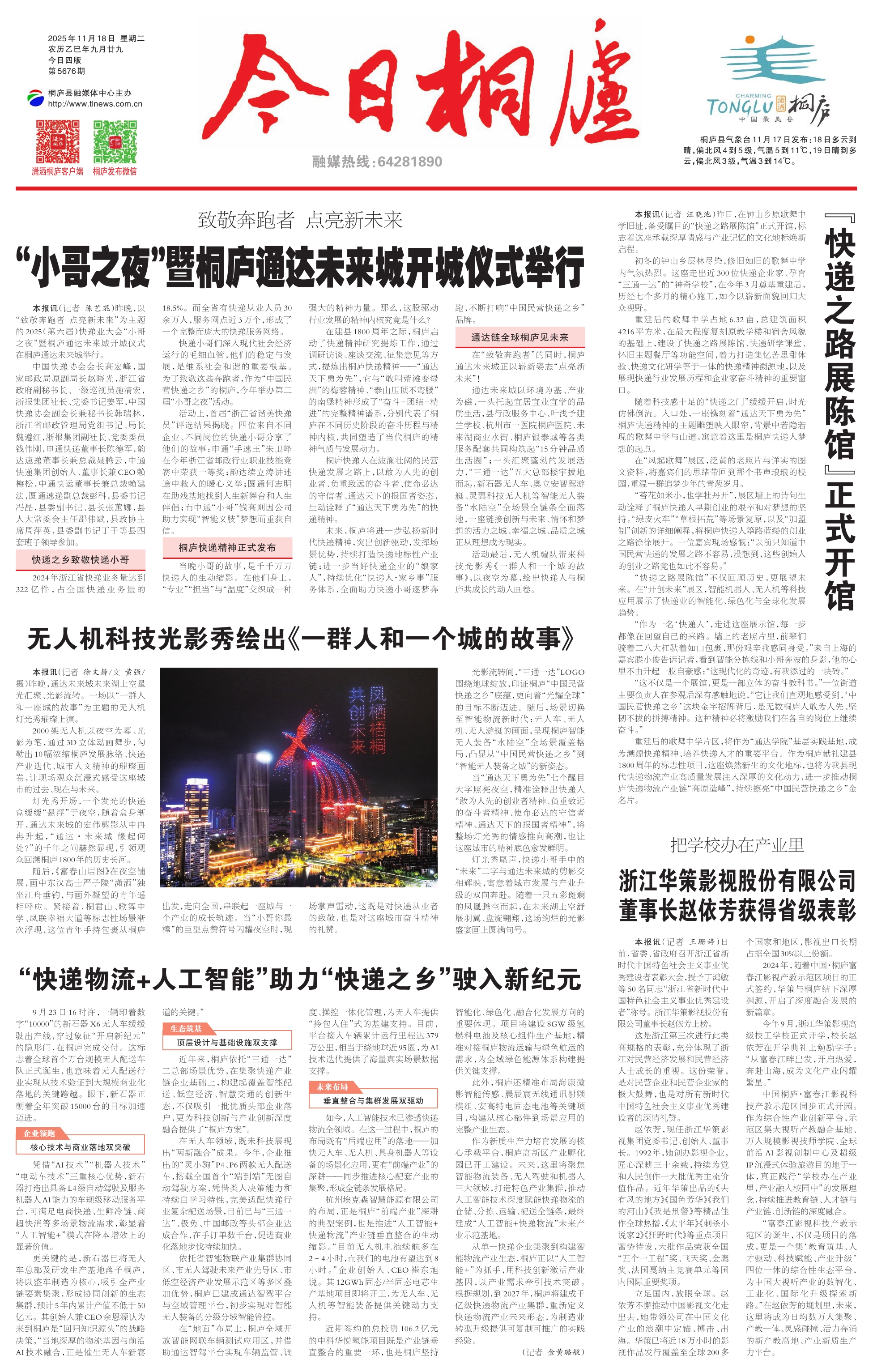 本报讯(记者 陈艺琨)昨晚,以“致敬奔跑者 点亮新未来”为主题的2025(第六届)快递业大会“小哥之夜”暨桐庐通达未来城开城仪式在桐庐通达未来城举行。
