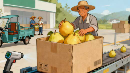 进入钟山蜜梨园,甜丝丝的香气就裹着风扑过来。一位皮肤晒得黝黑的农民伯伯,手里拎着竹篮,把一个个金黄的蜜梨放入我怀里,还特意垫了几层报纸。他擦了擦汗,把我往旁边放了放,生怕把我们弄坏。很快,我们身上被贴了快递单,上面写着:“新鲜蜜梨”。三轮车把我送去了网点,风吹过路边“中国快递之乡”的站牌,我激动地想:“任务要开始啦!”