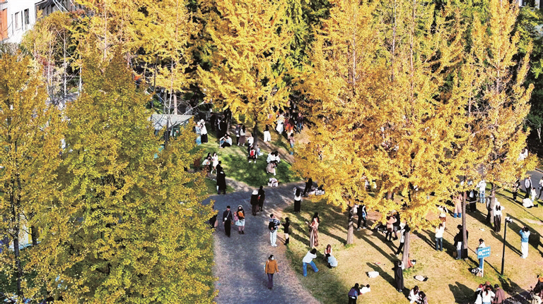 这几天,阳光明媚,浙江省国家大学科技园的银杏林已化身为金色秘境。走入园内,一棵棵银杏树正披上金色外衣,展现它们最美的姿态,吸引很多市民前来赏景拍照,邂逅美好。
