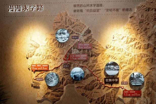 在展陈馆内,一幅“漫漫求学路”的地图,标刻出桐庐快递人求学时的艰辛:钟山乡夏塘村的聂腾飞、聂腾云、詹际盛,离歌舞中学有8公里山路;歌舞村张小娟、商学兵的上学路有3.5公里;阳田村赖梅松、赖建法的上学路有13公里;距离最近的子胥村陈德军,上学路也有1.2公里。