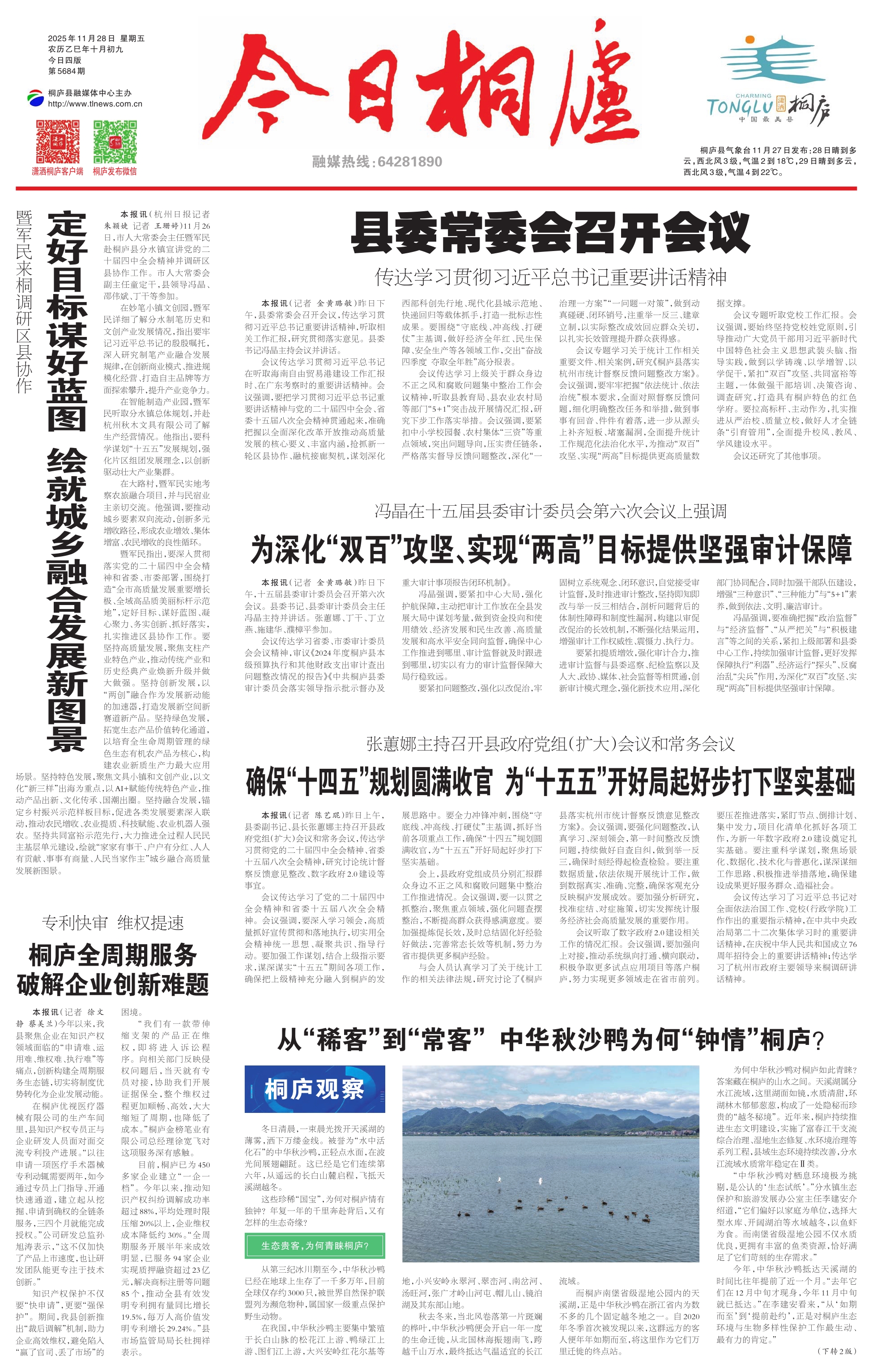 会议传达学习了党的二十届四中全会精神和省委十五届八次全会精神。会议强调,要深入学习领会,高质量抓好宣传贯彻和落地执行,切实用全会精神统一思想、凝聚共识、指导行动。要加强工作谋划,结合上级指示要求,谋深谋实“十五五”期间各项工作,确保把上级精神充分融入到桐庐的发展思路中。要全力冲锋冲刺,围绕“守底线、冲高线、打硬仗”主基调,抓好当前各项重点工作,确保“十四五”规划圆满收官,为“十五五”开好局起好步打下坚实基础。