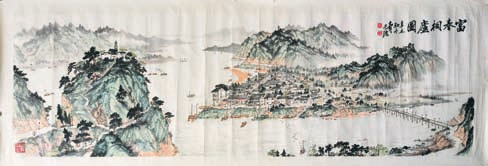 1959年3月,深入铜官峡、新安江水电站工地写生,作速写、水彩、局部、场景、全貌稿逾百幅,反复构图,几易数稿,终成代表作名作《新安江水电站卷》,该画将传统笔法结合西画透视、明暗处理的方法,散点透视与焦点透视结合,较完美地统一在淡青绿山水画幅中,反映了建设伟大工程的壮观景象。4月,赴严子陵钓台、七里泷富春江水电站建设工地、芦茨湾写生,得稿数十幅。