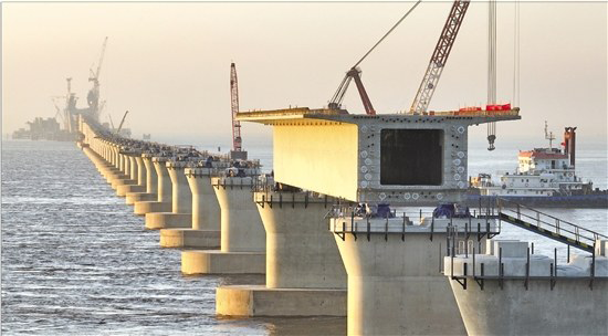 11月29日,杭州湾跨海铁路大桥宁波侧开启首孔箱梁架设。杭州湾跨海铁路桥全长29.2公里,采用时速350公里的双线无砟轨道设计,包括北、中、南三座航道桥和跨大堤、海中、浅滩区引桥。本次架设的首孔箱梁为80米跨径预制混凝土箱梁,整体总重达2804吨,相当于约2000辆小汽车的重量。