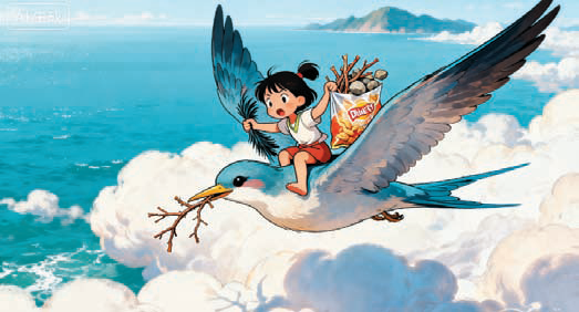 我和精卫穿梭在软绵绵的云层里,一同飞往西山。我摸了摸口袋,好像有什么东西,拿出来一看,原来是上次装零食的袋子,刚好能用来捡小树枝和石头。我们在西山收集了满满一袋“填海材料”,之后便扛着袋子,在云端朝着东海的方向飞去。