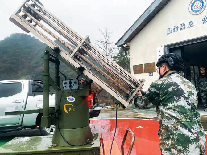本报讯(记者 华睿)12月23日晚11时30分,在瑶琳镇坞口水库的人工影响天气作业点位,县气象局工作人员有序地将人工影响作业弹装填进发射架。随着指令下达,“砰砰砰”几声响起,人影作业弹接连射向夜空,直奔云层,一次人工增雨作业顺利实施。